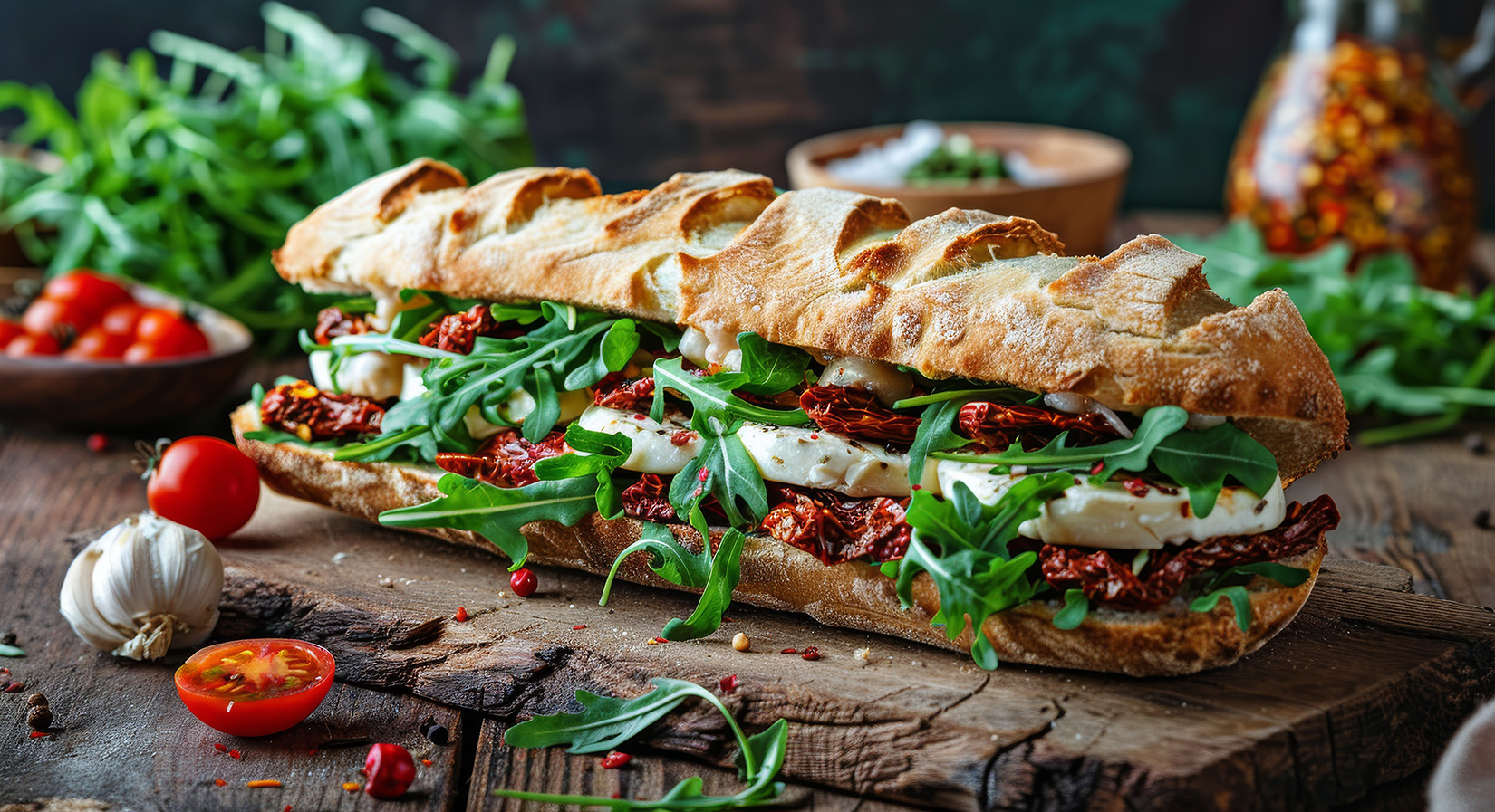 Genoa salami, sweet capicola, pistachio mortadella, arugula or spring mix, provolone, tomato, cucumber, onion, pepperoncini, Italian dressing, mayo, salt & pepper.