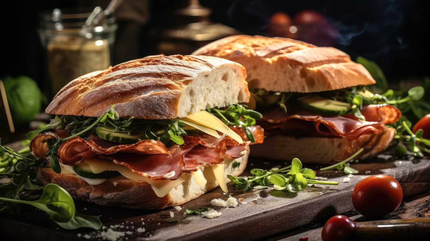 Italian ham, cheddar cheese, arugula or spring mix, tomato, onion, mayo, and mustard.